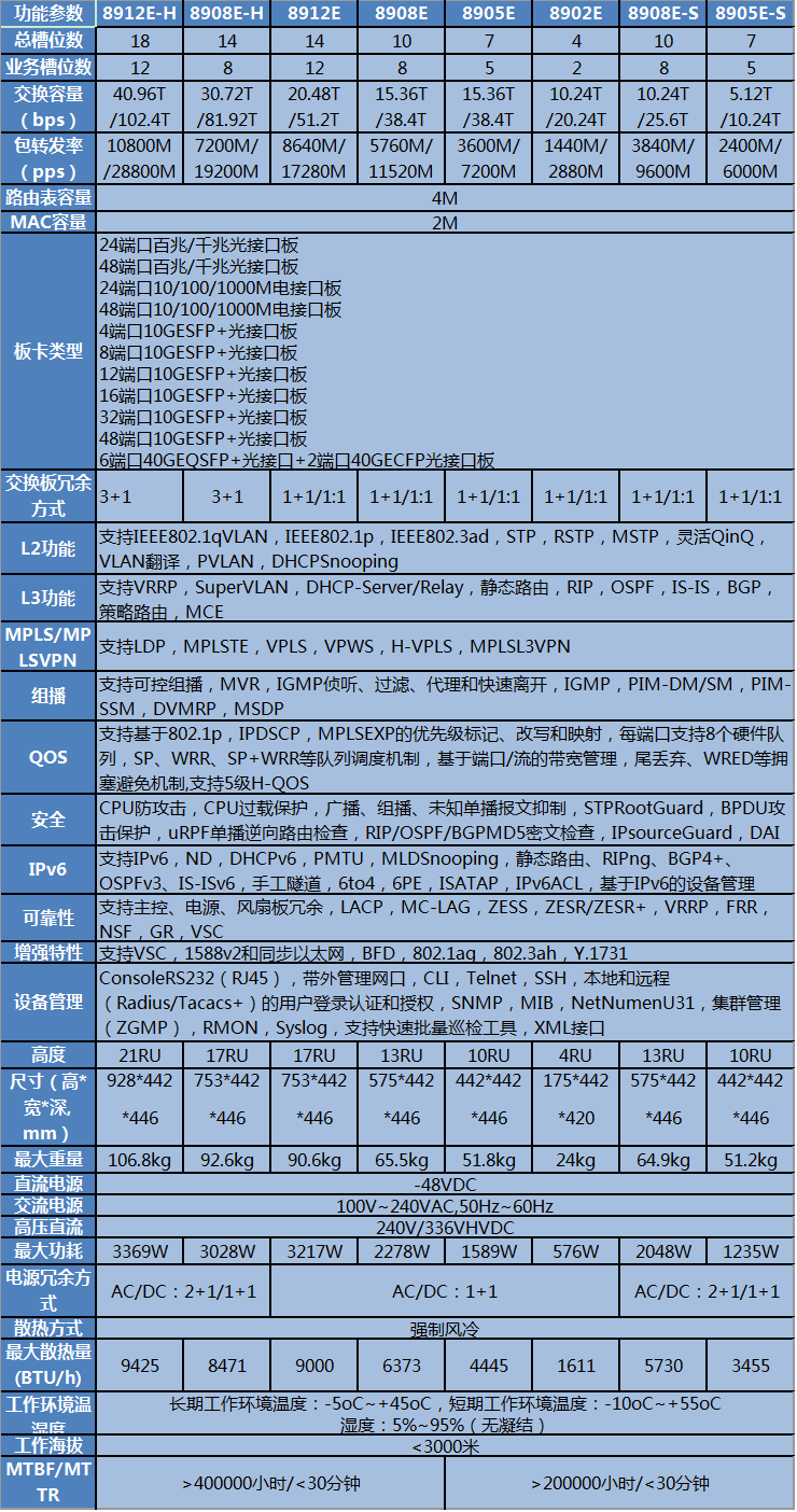 ZXR10 8900E系列核心交换机包含8902E、8905E、8908E、8912E四个产品形态,提供多种业务槽位数量的选择,业务板卡不同机型间相互通用,降低备件成本,保护投资。